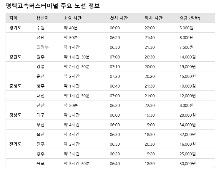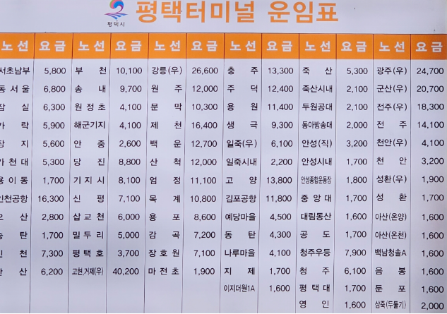 평택고속버스터미널 주요 노선 및 요금