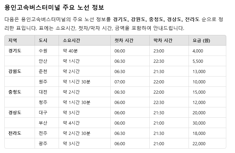 - 용인고속버스터미널의 요금은 일반 버스 기준이며, 우등이나 프리미엄 버스의 경우 요금이 추가됩니다.