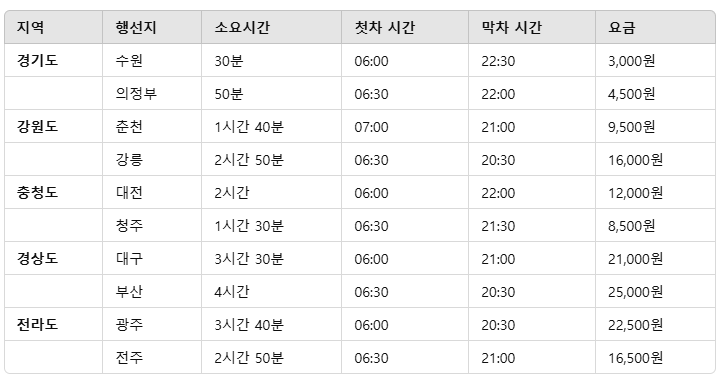 - 첫차와 막차 시간은 터미널 사정에 따라 변경될 수 있으니 이용 전에 반드시 확인하시기 바랍니다.