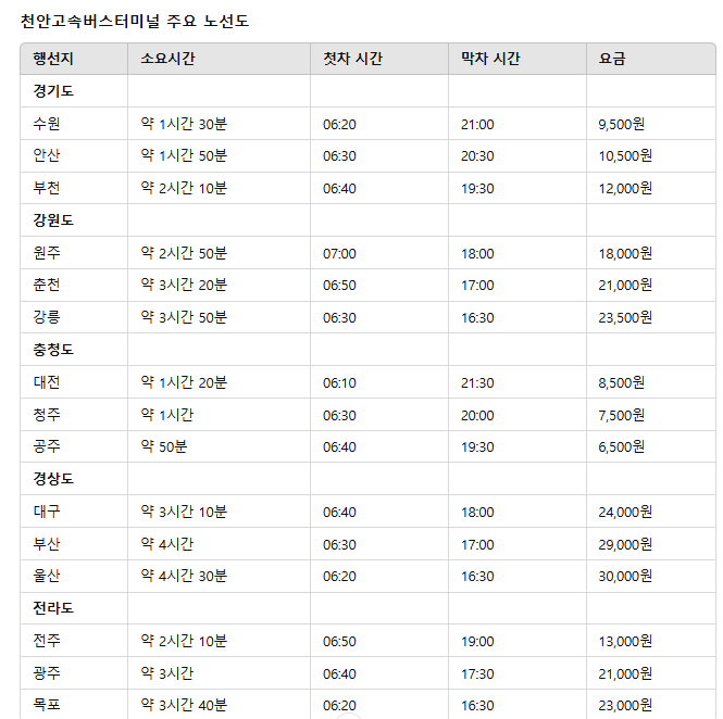 천안고속버스터미널 주요 노선 및 요금
