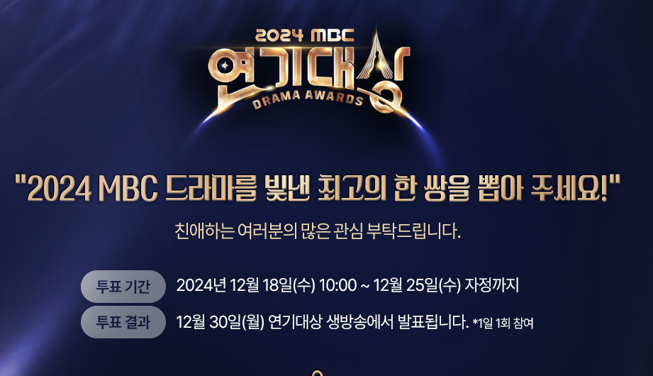 + 아래의 링크를 통해서 2024 MBC 연기대상 베스트커플상 투표 할 수 있는 사이트로 이동 됩니다.