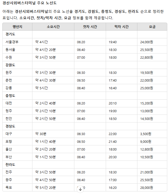 경산시외버스터미널 주요 노선 및 요금