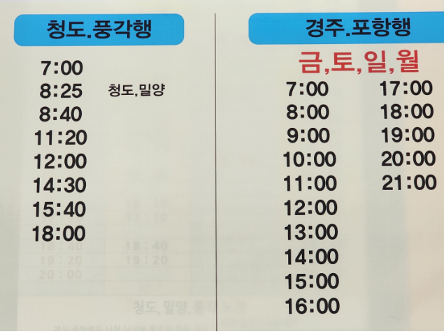 - 첫차와 막차 시간은 터미널 사정에 따라 변경될 수 있으니 이용 전에 반드시 확인하시기 바랍니다.