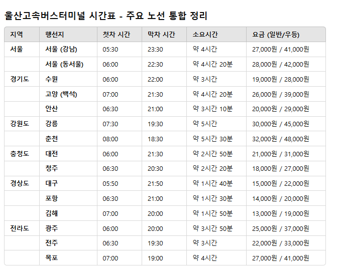 - 울산고속버스터미널의 요금은 일반 버스 기준이며, 우등이나 프리미엄 버스의 경우 요금이 추가됩니다.