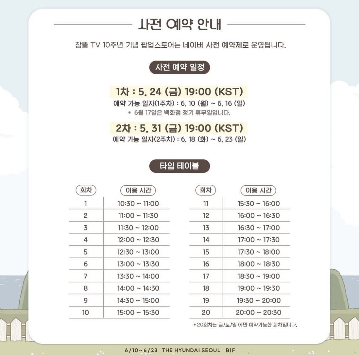 4) 20회차(20:00~20:30)는 금/토/일만 예약 가능 합니다.