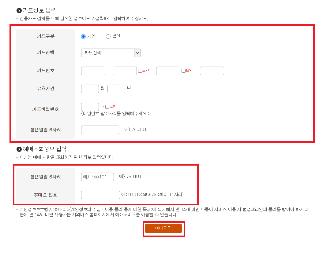 5️⃣ 이용약관을 전체 동의 한 후 , 카드 정보를 입력 하여 예약을 완료 합니다.
