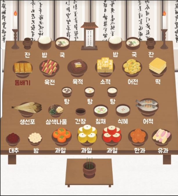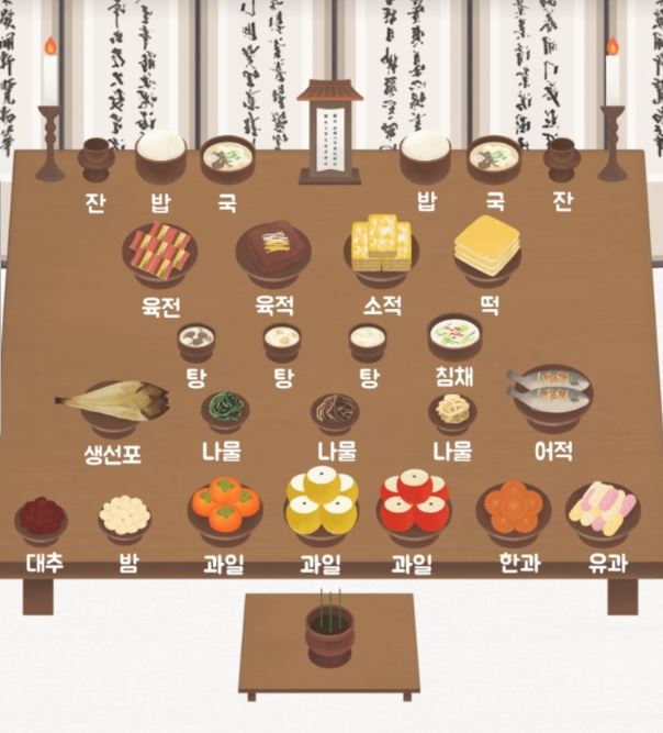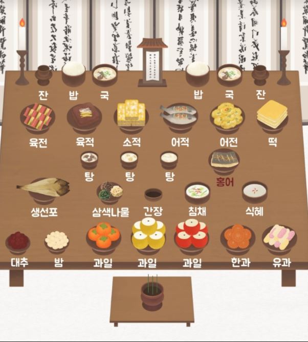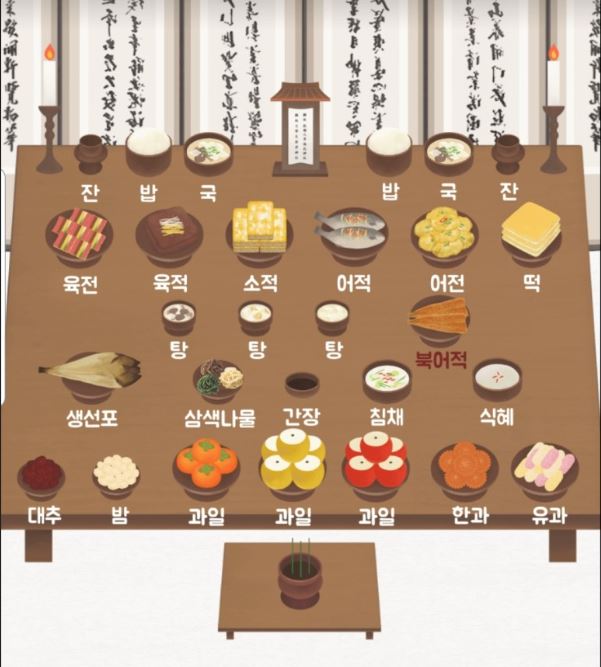 - 배치 순서: 과일, 전, 고기류, 해산물, 밥과 국 순으로 5열 배치가 일반적입니다.