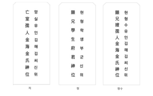 - 어머니: 顯妣○○大人神位 (현비 ○○대인 신위)