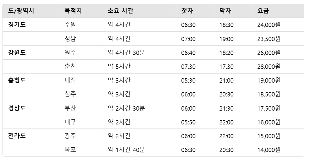 여수시외버스터미널 주요 노선 및 요금
