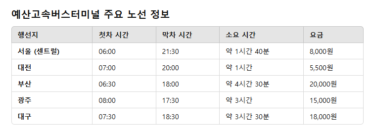 예산고속버스터미널 주요 노선 및 요금
