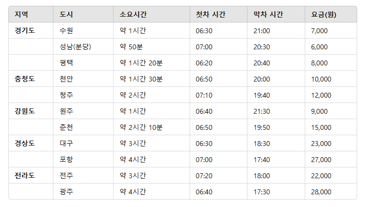- 요금은 일반석 기준으로, 우등/프리미엄 이용 시 추가 요금이 부과될 수 있습니다.