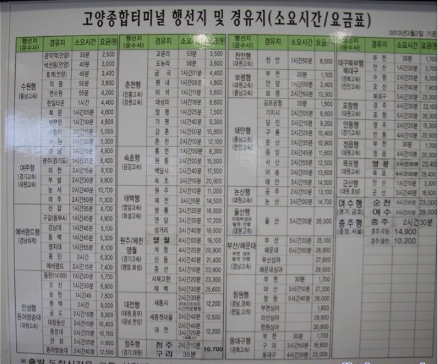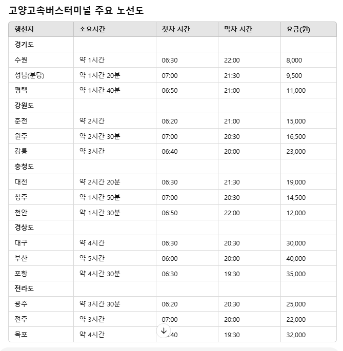 고양고속버스터미널 주요 노선 및 요금