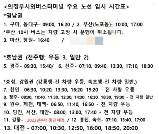 의정부시외버스터미널 주요 노선 및 요금